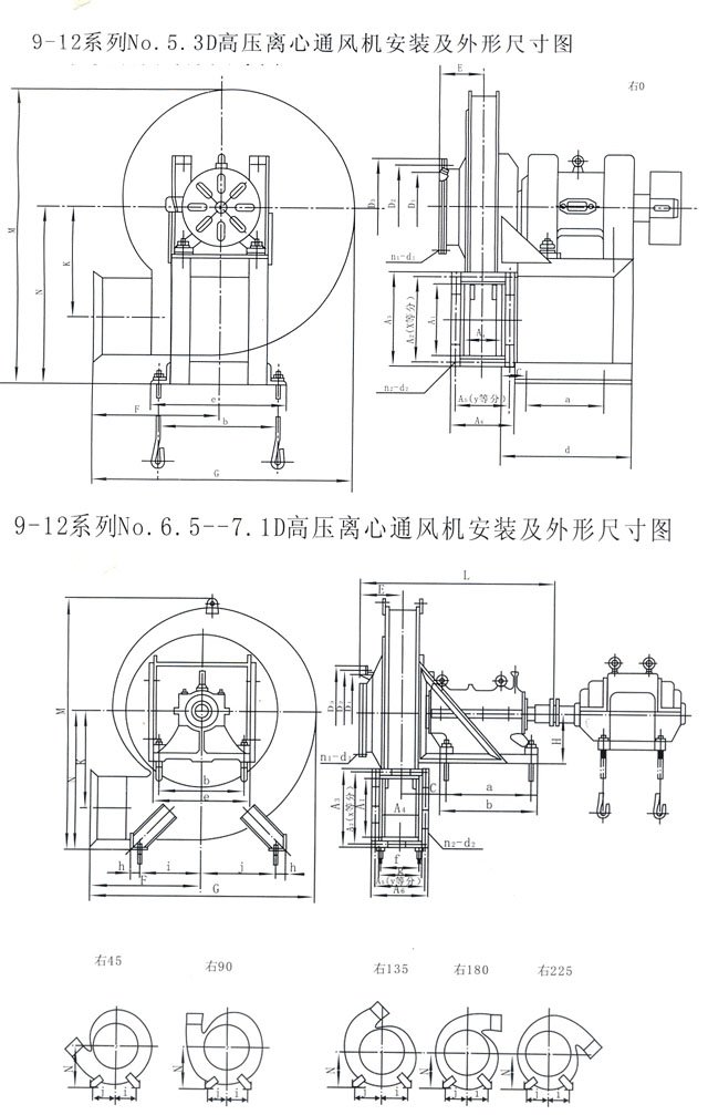 1、8-09、9-12型风机均为单吸入,8-09型风机,我公司设计机号有№ 6.8A、7.1D、8D、8.5D、9D五个机号。9-12型风机我公司设计机号有№ 6.8A、7.1A、7.4D、7.7A、8D、9D六个机号。