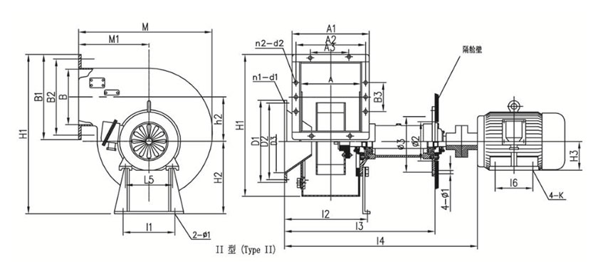 II型(隔舱室)为防爆通风机和电机分隔舱结构,由风机、传动、弹性联轴器、电动机等组成。传动组由轴承座、轴承、轴、铜环、密封填料函等组成,能测温加油。一端直联防爆通风机,一端直联隔舱壁。