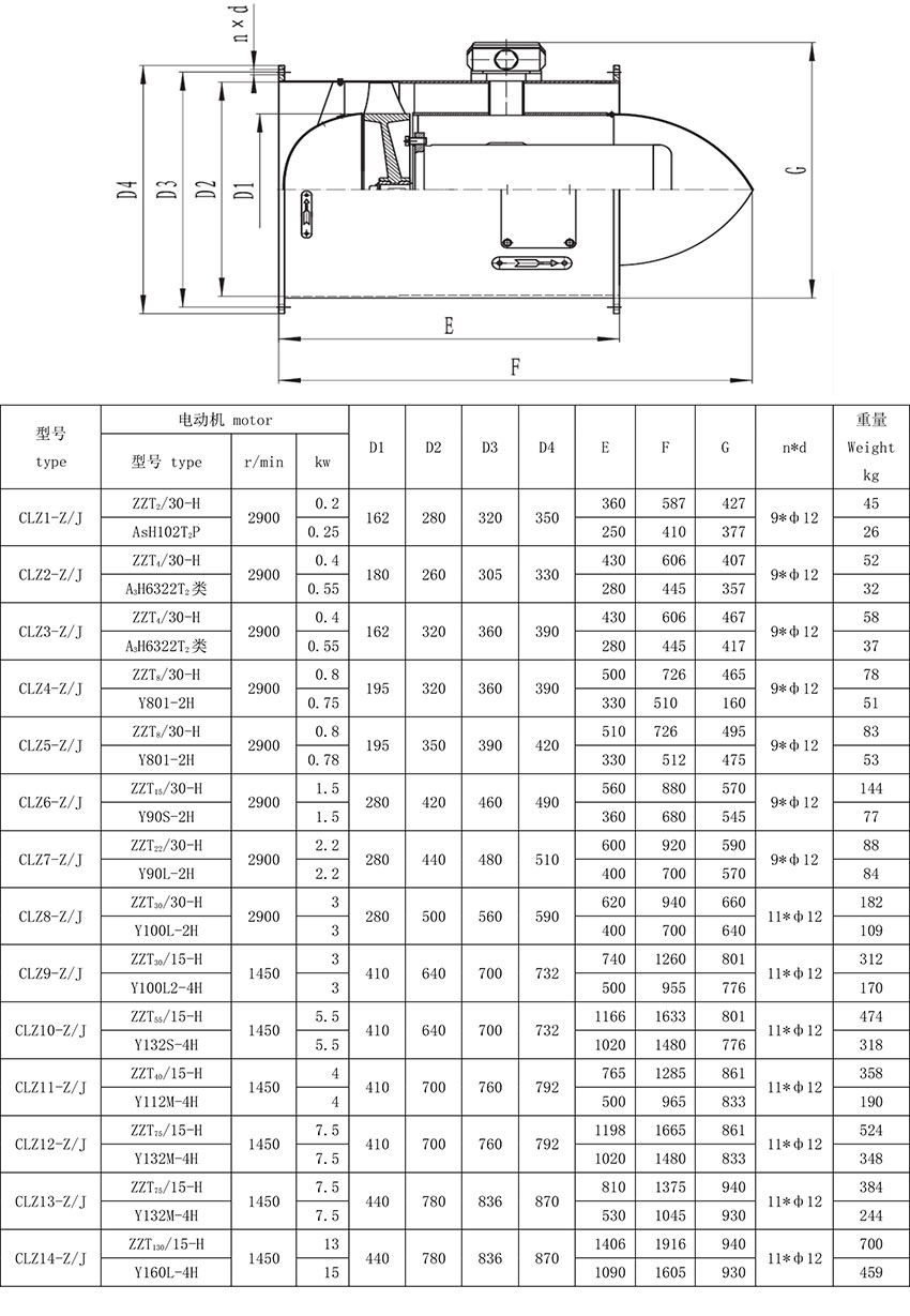 备注:本表所列性能均指在温度为20℃相对湿度50%,大气压力101325P,气体比重1.2Kg/立方米,标准转速下的情况。
