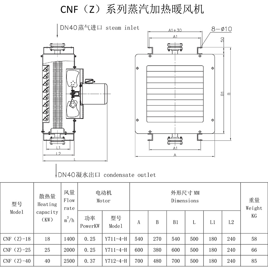 CNF(Z)蒸汽系列暖风机由散热盘管、叶轮、集风圈、电机等组成。散热排管、散热翅片采用机械绕片方法,绕在散热管上(根据需要也可采用套片),散热翅片与散热管接触面广而紧,从而提高了传热性能和工作压力,加热介质一般为0.3MPa饱和蒸汽,最高饱和蒸汽工作压力为1.OMPa,叶轮采用LF3防锈铝,机壳采用普通钢板或不锈钢板焊接而成。