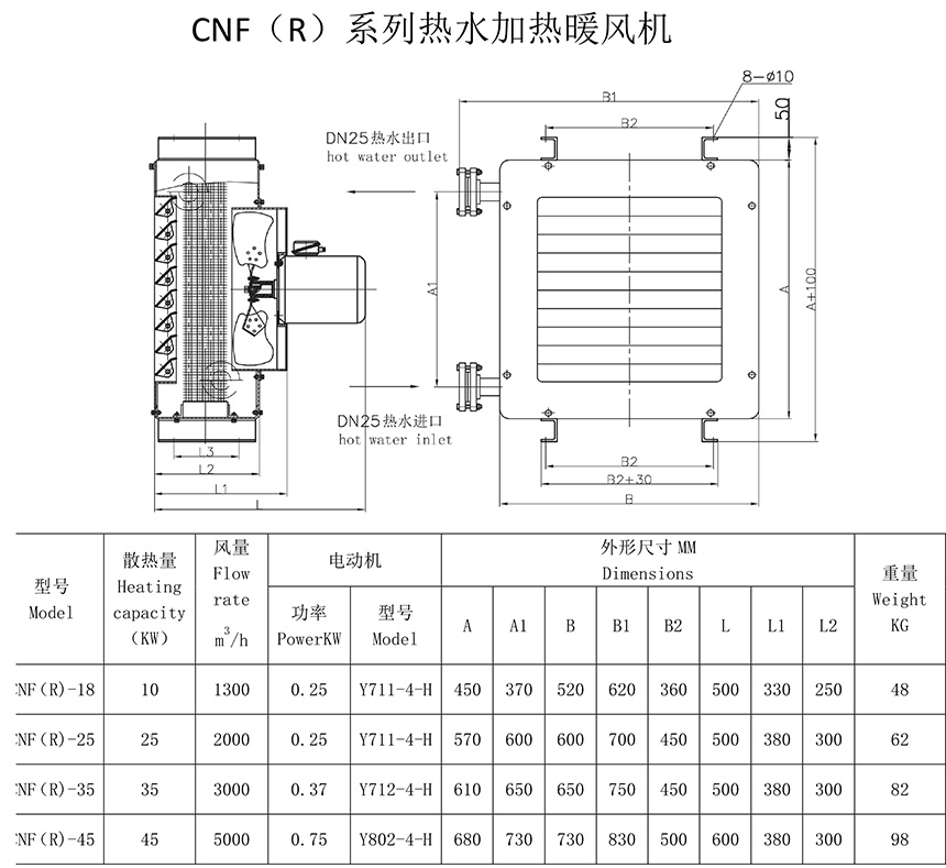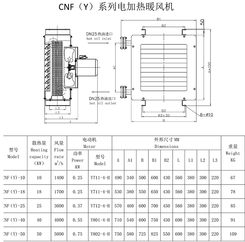 CNF(Y)热油系列暖风机由散热盘管、叶轮、集风圈、电机等组成。散热盘管采用不锈钢管外绕不锈钢带;加热介质一般为0.8~1.5MPa热油,叶轮采用LF3防锈铝,机壳采用普通钢板或不锈钢板焊接而成。