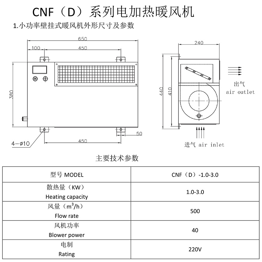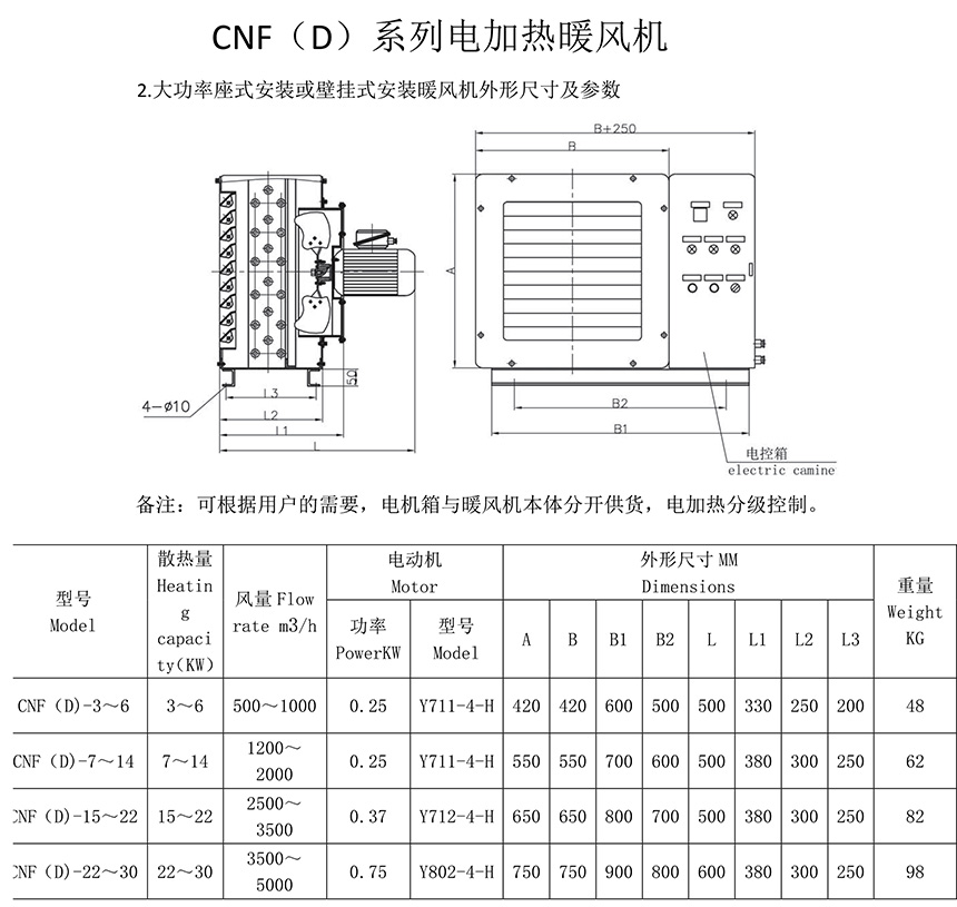 CNF(D)电加热系列暖风机由电加热器、叶轮、集风圈、电机、电控箱等组成。电加热器的电加热管采用机械绕片的方法将不锈钢带绕在不锈钢管上,叶轮采用LF3防锈铝;机壳、电控箱采用普通钢板或不锈钢板焊接而成。