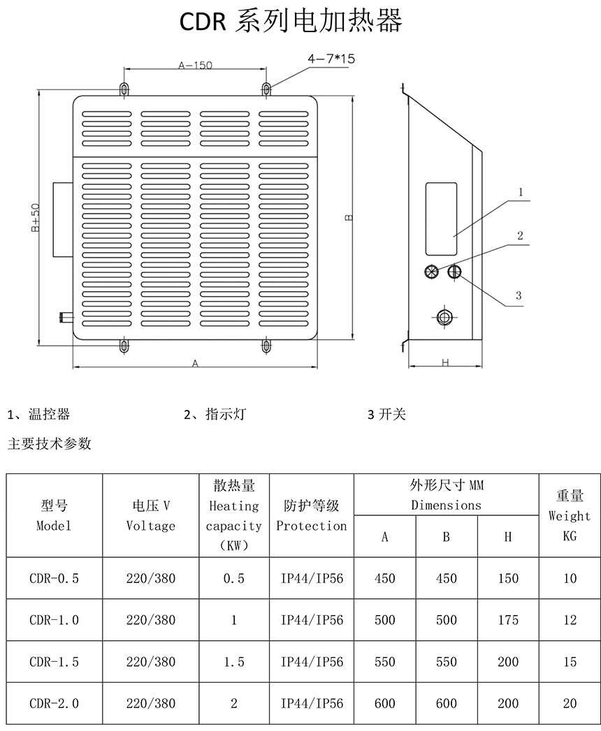 产品外观关观大方,外壳材料采用不锈钢,表面作静电喷涂处理。加热管采用不锈钢翅片电加热管制热方式,防潮、耐腐蚀,具有加热快、除湿快、热效率高,散热均匀、温度可调等特点,是冬季舱室内取暖的理想产品。电控部分防护等级可达到TP56,产品采用壁挂式薄形设计,不占空间,广泛用于舰船、工厂、宾馆、野外车辆等。